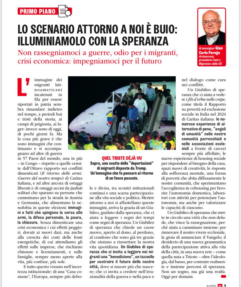 27 Febbraio 2025 – “L’immagine dei latinoamericani incatenati in fila per essere riportati in patria sembra rimandare indietro nel tempo, a periodi bui e tristi della storia, ai campi di prigionia, ai lager: invece sono di oggi, di pochi giorni fa. Ma la cosa più grave è che sono immagini che continuano e si accompagnano ad altre di guerra in 57 Paesi del mondo”. Inizia così il pezzo a pagina 3 del numero di Famiglia Cristiana appena pubblicato, firmato da S.E. mons. Gian Carlo Perego, arcivescovo di Ferrara-Comacchio e presidente della CEMi e della Fondazione Migrantes.