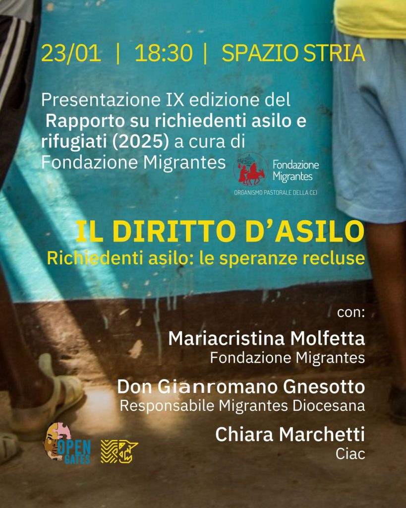 Venerdì 23 gennaio, a partire dalle ore 18:30, è in programma a Padova – presso lo Spazio Stria, in piazza Gasparotto 4 – una presentazione della IX edizione del Report “Il diritto d’asilo”, su richiedenti asilo e rifugiati, della Fondazione Migrantes.