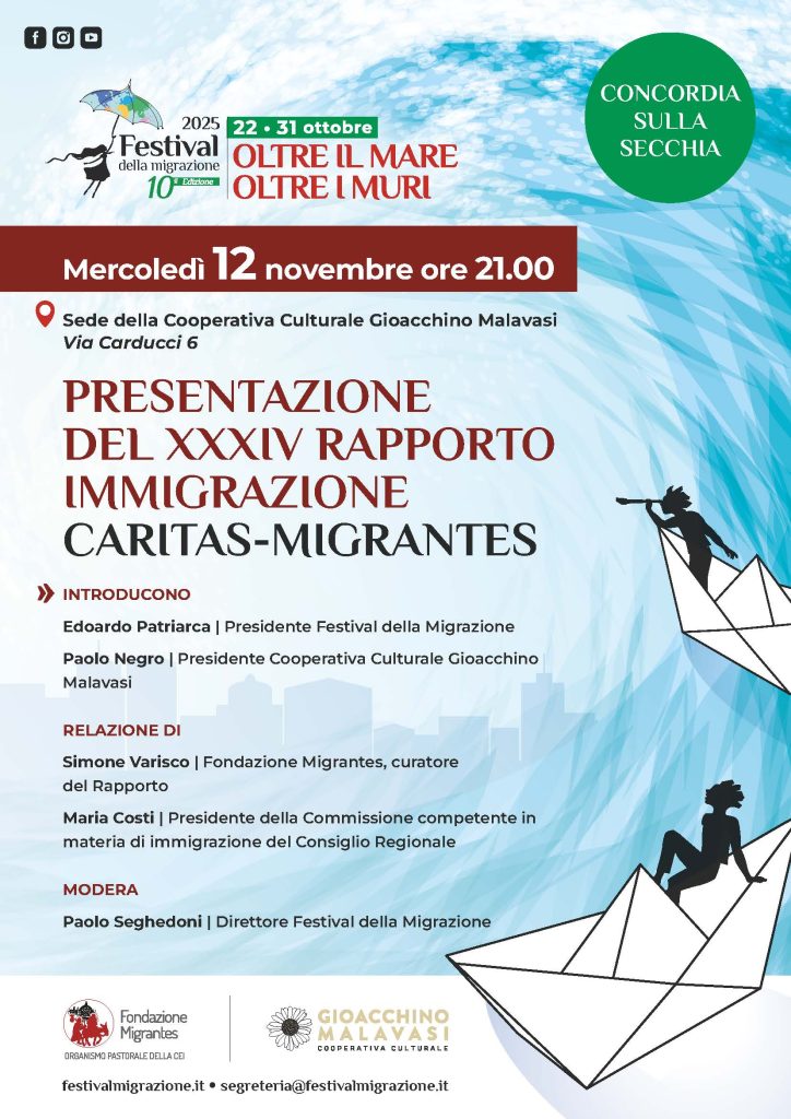 11 Novembre 2025 - La Cooperativa culturale Gioacchino Malavasi ospita, mercoledì 12 novembre alle ore 21.00 nella propria sede di Via Carducci 6 a Concordia sulla Secchia, la presentazione del XXXIV Rapporto Immigrazione Caritas–Migrantes, dal titolo “Giovani, testimoni di speranza”.
