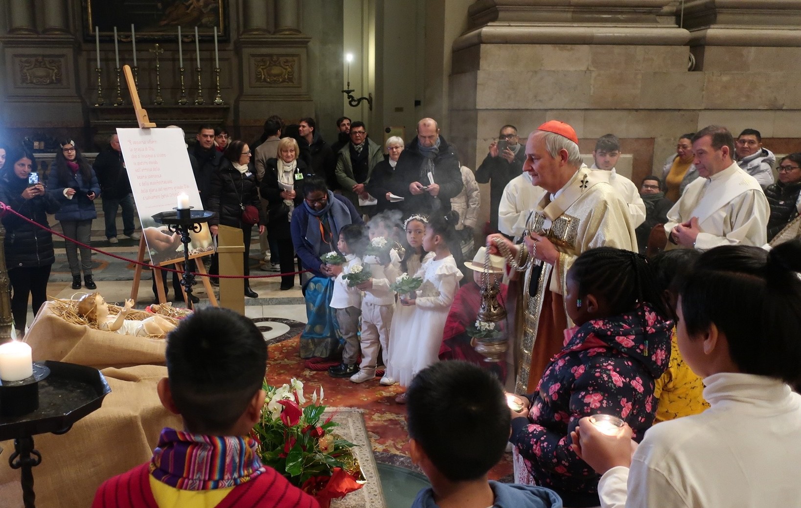 Il rito battesimale era stato preceduto dal canto delle Litanie dei Santi. Anche queste sono diventate un viaggio spirituale attraverso i nomi di martiri, di ragazzi, uomini e donne, che da ogni parte della terra sono stati testimoni della fede e dell'amore di Dio. Al momento dell'offertorio si è rinnovato quasi visivamente il mistero della prima Epifania. Dopo i nuovi battezzati e cresimati che hanno portato all'altare il pane e il vino per l'Eucarestia, i rappresentanti di gruppi e comunità hanno portato al Vescovo i doni destinati alle opere di carità. I sacerdoti delle comunità Migrantes hanno offerto al Vescovo una nuova mitra per il Giubileo. Il Cardinale ha invitato le comunità a essere unite nella fede e nel servizio del Vangelo. «Ci ha portato tutti qui, nella casa del Signore, per essere noi tutti la sua casa, la sua famiglia, senza confini, fratelli e sorelle tutti. Che gioia vederlo, sentirlo, viverlo. E ciascuno di noi si ricordi di vivere ovunque come un fratello o una sorella di Gesù e quindi di tutti. Una famiglia davvero universale, cattolica. Amiamo questa casa, le nostre comunità. Facciamole crescere invitando altri che, come noi, cercano speranza, luce, futuro, che qualche volta non ne hanno più. E noi possiamo essere un pochino di quella stella che gli dice «vieni, c'è luce, ti porto la luce, l'amore di Gesù». Siamo e restiamo diversi, - ha proseguito il Cardinale - ma per noi la diversità non è un problema, anzi è un dono, una ricchezza, ci dà forza. E la Chiesa, con questo suo unico cuore, aiuta tutti a essere se stessi, insieme e non divisi, una ricchezza gli uni per gli altri.
