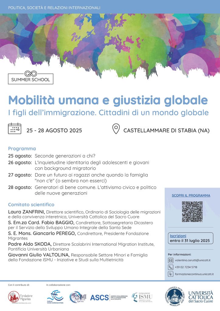 Summer School “Mobilità Umana e Giustizia Globale”, in programma dal 25 al 28 agosto 2025, che si tiene quest’anno a Castellammare di Stabia (NA) e si focalizza sul tema dei “figli dell’immigrazione”, confrontandosi con la delicata questione delle seconde generazioni.