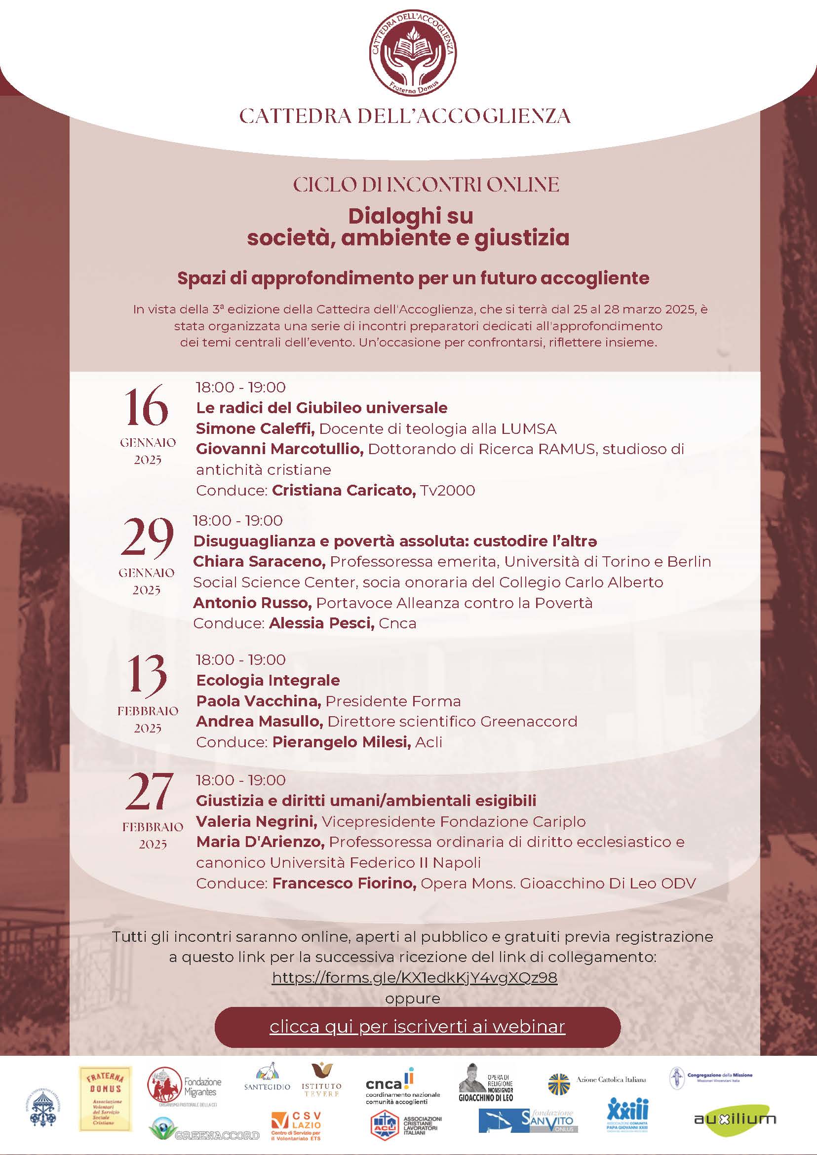 17 Gennaio 2025 - Ha preso il via il 16 gennaio un ciclo di quattro incontri online, "Dialoghi su società, ambiente e giustizia", i temi proposti dal Giubileo, per provare a costruire un futuro più accogliente. Questi momenti sono pensati in vista della terza edizione della Cattedra dell'Accoglienza, che si terrà dal 25 al 28 marzo 2025,