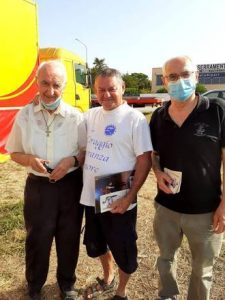 A circa un chilometro di distanza abbiamo incontrato due persone titolari di strutture di divertimento del luna park di Valverde in viale Carducci, che da tempo “giocondano” la nostra città per la gioia di ragazzini e bambini. Con sorpresa, abbiamo appreso che un titolare di una giostra è di Santarcangelo di Romagna e l’altro, responsabile organizzativo dell’intero luna park, è proveniente da Cesena, parrocchia di San Mauro in Valle. Dopo alcuni scambi di informazioni che sicuramente renderebbero interessante ogni approfondimento, abbiamo consegnato anche a loro il nostro materiale religioso e li abbiamo salutati e ringraziati per la cortese accoglienza, lasciandoci alle spalle le tante case mobili abitate (roulotte, camper ecc.) che rappresentano il motivo della presenza della Chiesa anche per queste persone itineranti.