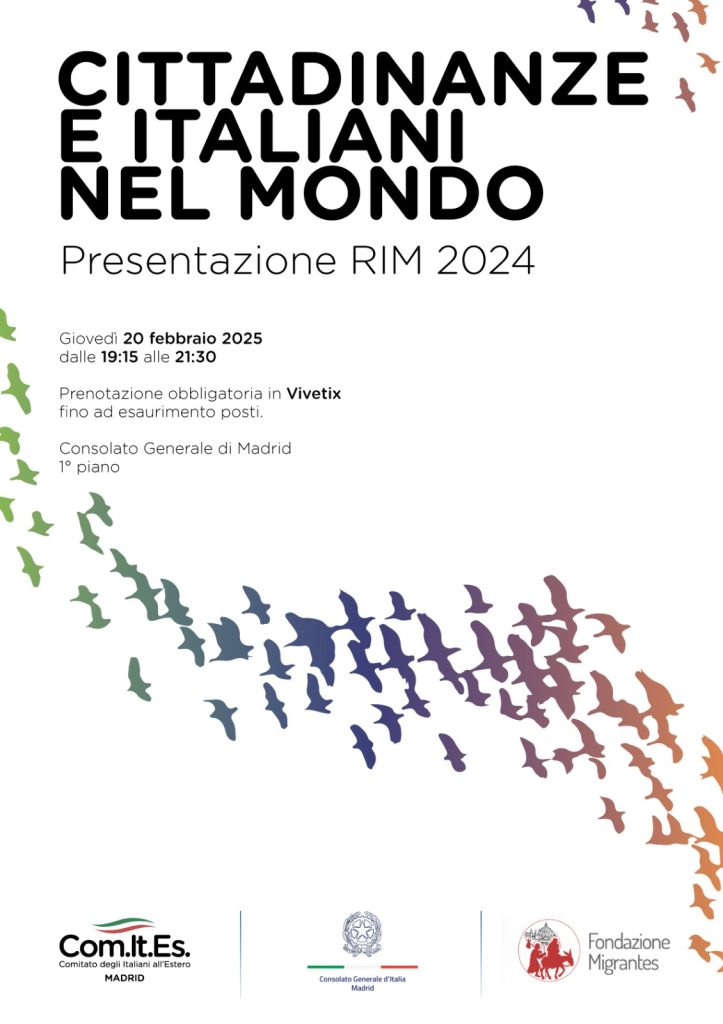 11 Febbraio 2025 - Il Comites di Madrid ha organizzato per giovedì 20 febbraio, presso il Consolato Generale d’Italia (c/Agustín de Betancourt 3) la presentazione del Rapporto Italiani nel Mondo 2024 (RIM 2024), realizzato dalla Fondazione Migrantes, organo della Conferenza Episcopale Italiana (CEI).