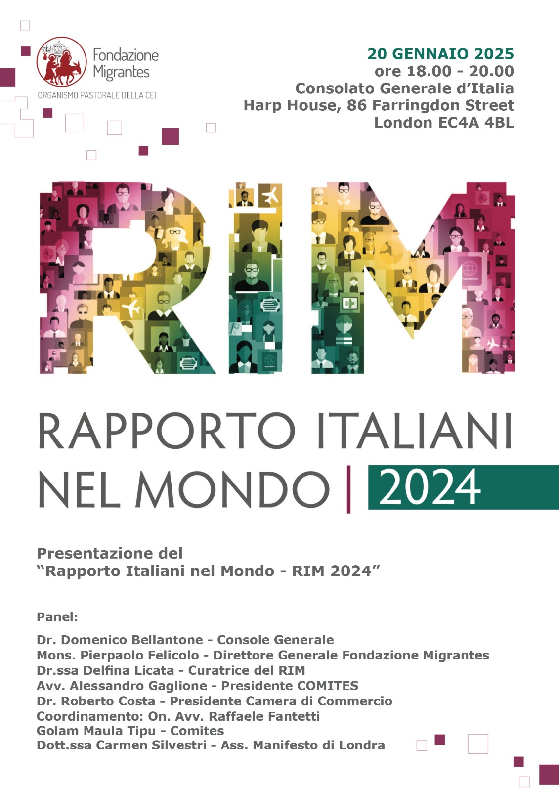 16 Gennaio 2025 - Lunedi 20 gennaio, alle ore 18, il Consolato Generale d'Italia a Londra, con il coordinamento dell'on. Raffaele Fantetti e la collaborazione del Comites di Londra, ha organizzato la presentazione del “Rapporto Italiani nel Mondo - RIM 2024” a cura della Fondazione Migrantes.