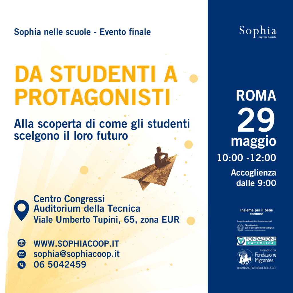 27 Maggio 2025 - Il 29 maggio 2025, presso l’Auditorium della Tecnica (zona EUR, Roma), si è tenuto “Da Studenti a Protagonisti”, l’evento conclusivo dei progetti educativi della Cooperativa Sophia nelle scuole, dove studenti italiani, dello spettacolo viaggiante e senegalesi presenteranno la loro risposta alla domanda: “Come scelgo il mio futuro?”. Presente anche il direttore generale della Fondazione Migrantes, mons. Pierpaolo Felicolo.